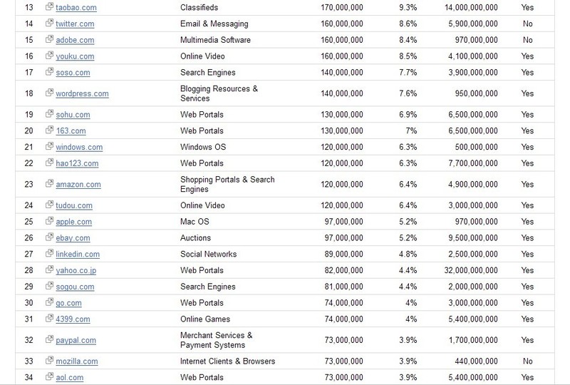 Google正式更新了全球排名前100名的網(wǎng)站排行版信息,國內(nèi)百度擠入第8名,獨立訪問量3.1億,QQ排名第10名,獨立訪問是 2.5億,F(xiàn)acebook穩(wěn)坐名獨立訪問量為8.7億,58同城上升到在第78位,姚建波在微博表示,爭取今年進入全球前58名,相信對于國內(nèi)90%的站長來說還是個夢,繼續(xù)努力。