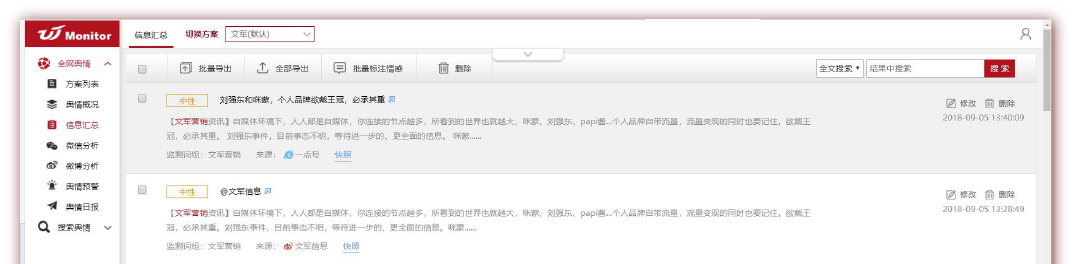 技術領先基于大數據的智能輿情監控,自主爬蟲采集,24小時不間斷服務。 快速輿情問題第一時間預警,保證運營人員快速發現問題,節省重復操作的人力成本。 準確數據挖掘與分析模型輔助提高對客觀數據分析結果的準確性。 定制化解決方案針對檢測結果,專屬項目顧問提供定制化解決方案,提升美譽度。